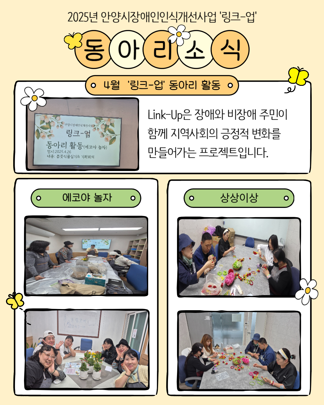 ‘에코야 놀자’는 실내 봄꽃 식물 심기를, ‘상상이상’은 양말목을 활용한 악세서리 만들기 활동을 진행하며, 장애와 비장애 주민이 한 공간에서 소통하고 협력하는 따뜻한 시간을 나누었습니다.