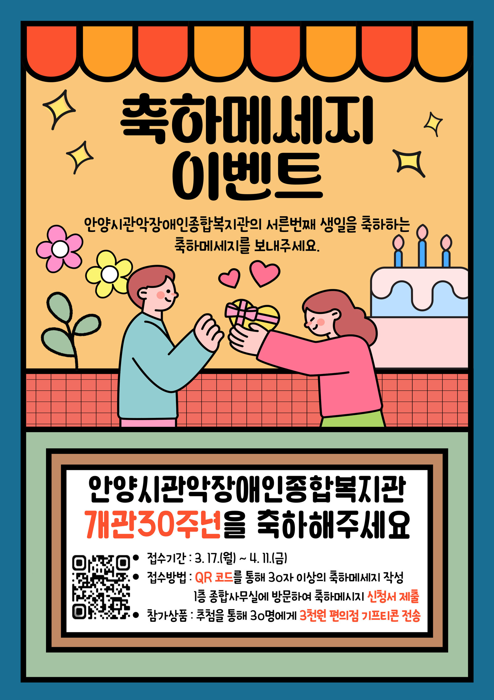 안양시관악장애인종합복지관 개관 30주년을 맞이하여 축하메세지 이벤트를 진행합니다.