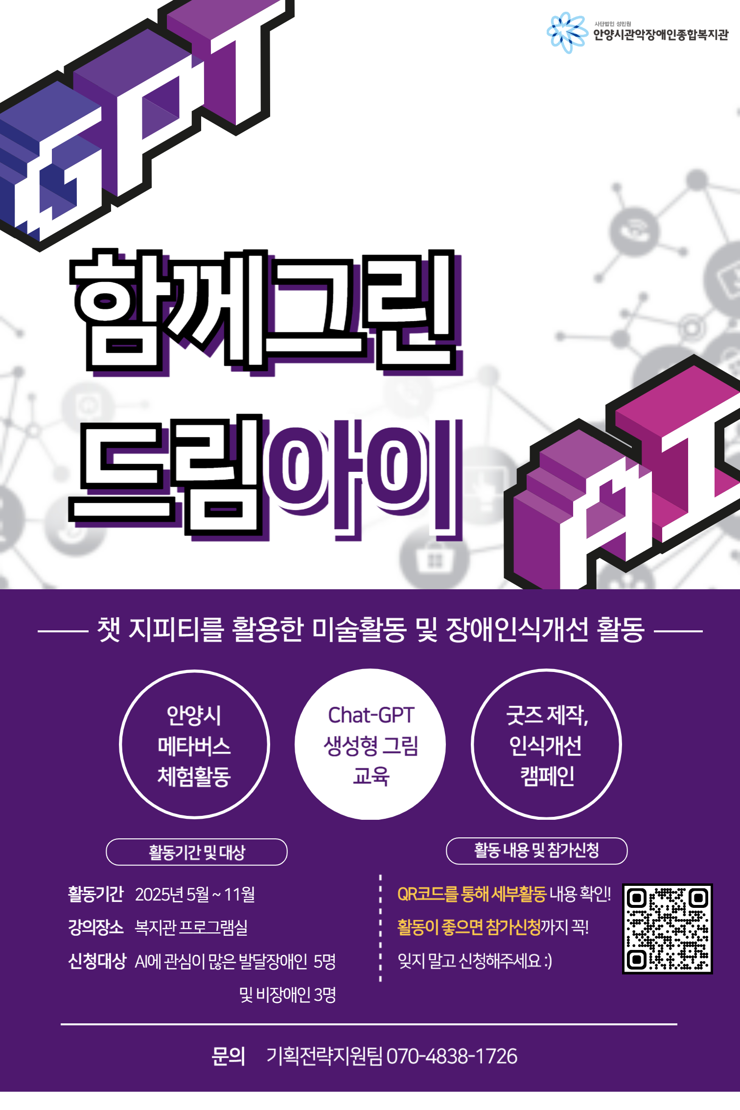 2025년 안양시장애인식개선사업 '함께 그린 드림아이(AI)' 프로그램에 함께 할 발달장애인 참여자를 모집합니다.