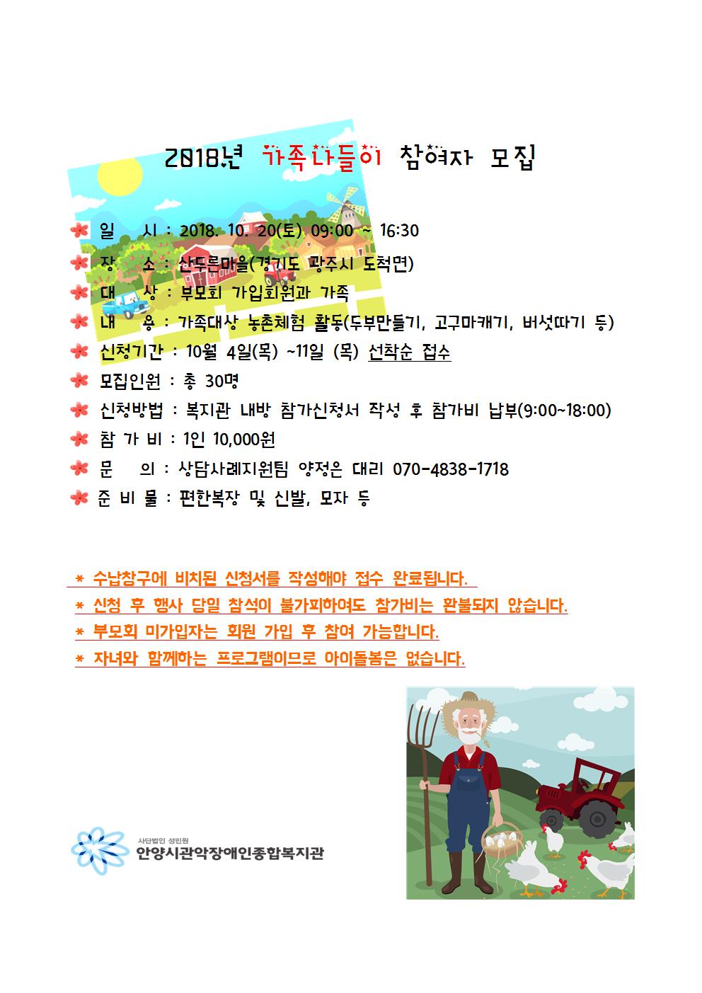 내 용 : 가족대상 농촌체험 활동(두부만들기, 고구마캐기, 버섯따기 등)