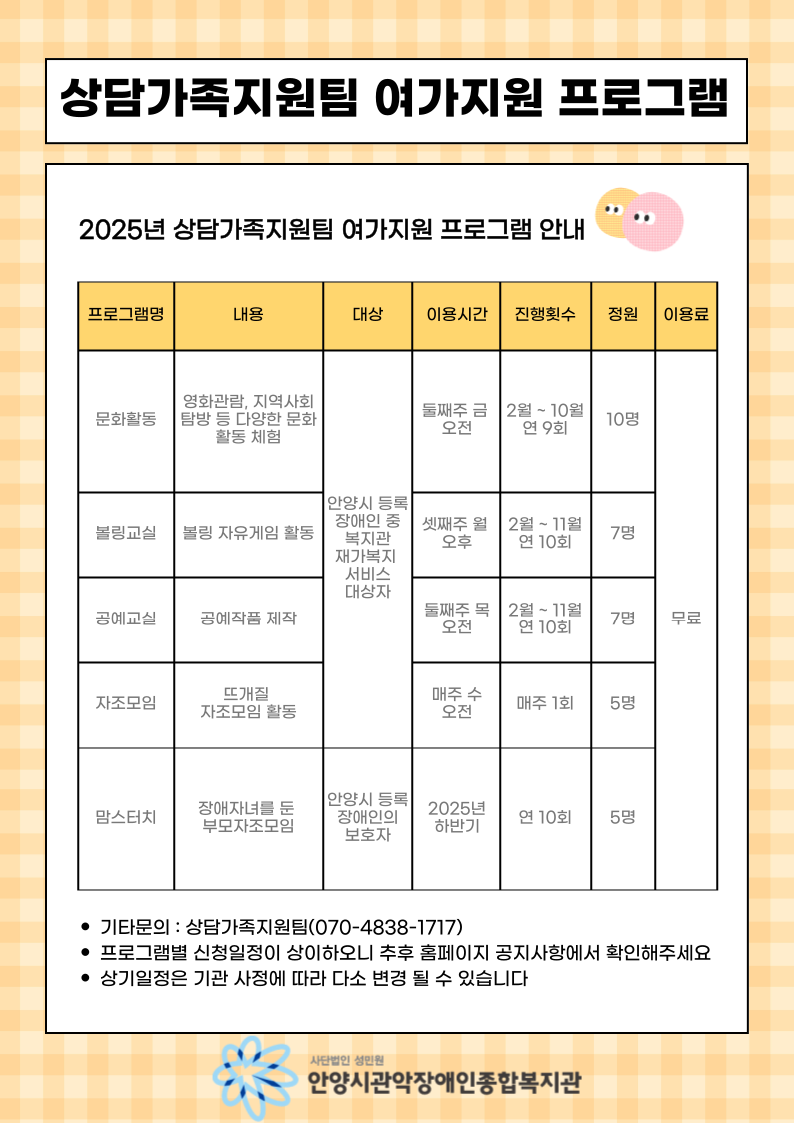 안녕하세요. 상담가족지원팀 여가지원 프로그램 안내드립니다.