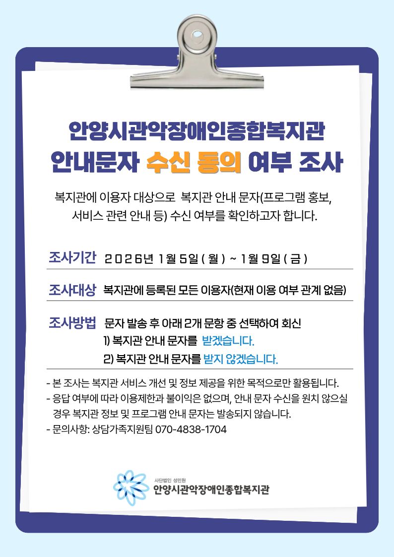안양시관악장애인종합복지관 안내문자 수신 동의 여부 조사 공지