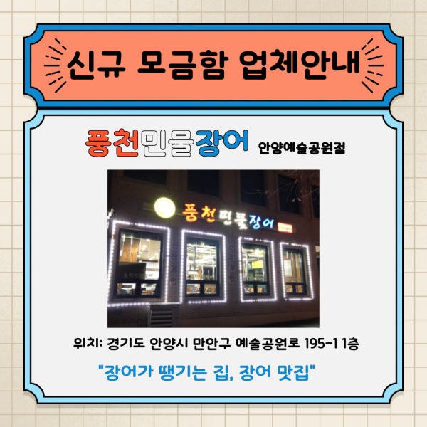 목록 풍천민물장어 안양예술공원점 페이지 정보 이재인 조회 33 입력 2025-04-08 17:21 댓글 0 본문 위 업체는 안양시관악장애인종합복지관에 후원해주시는 '든든한 이웃'입니다.많은 관심과 이용부탁드립니다.주소: 경기도 안양시 만안구 예술공원로 195-1, 1층풍천민물장어 안양예술공원점 풍천민물장어 안양예술공원점<<<클릭 목록 이전글진아구 안양예술공원점 2025.04.08 다음글2024년 모금함비치업체 2025.01.02 댓글 0 댓글목록 등록된 댓글이 없습니다.