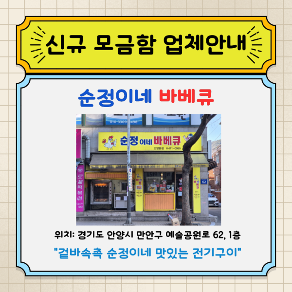 목록 순정이네 바베큐 페이지 정보 이재인 조회 33 입력 2025-04-08 17:27 댓글 0 본문 위 업체는 안양시관악장애인종합복지관에 후원해주시는 '든든한 이웃'입니다.많은 관심과 이용부탁드립니다.주소: 경기도 안양시 만안구 예술공원로 62, 1층순정이네바베큐 순정이네바베큐<<<클릭 목록 이전글박대운숯불돼지갈비 2025.04.08 다음글진아구 안양예술공원점 2025.04.08 댓글 0 댓글목록 등록된 댓글이 없습니다.