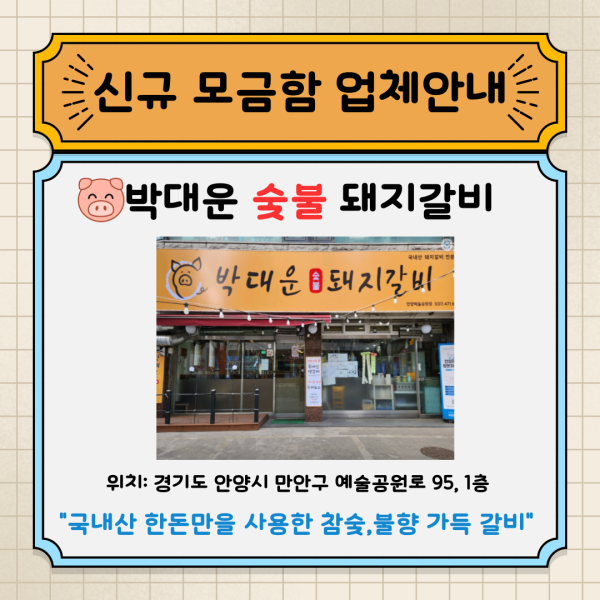 목록 박대운숯불돼지갈비 페이지 정보 이재인 조회 43 입력 2025-04-08 17:28 댓글 0 본문 .위 업체는 안양시관악장애인종합복지관에 후원해주시는 '든든한 이웃'입니다.많은 관심과 이용부탁드립니다.주소: 경기도 안양시 만안구 예술공원로 95, 1층박대운 숯불 돼지갈비 박대운숯불갈비 안양예술공원점<<<클릭 목록 이전글맷돌로만 안양예술공원점 2025.04.08 다음글순정이네 바베큐 2025.04.08 댓글 0 댓글목록 등록된 댓글이 없습니다.