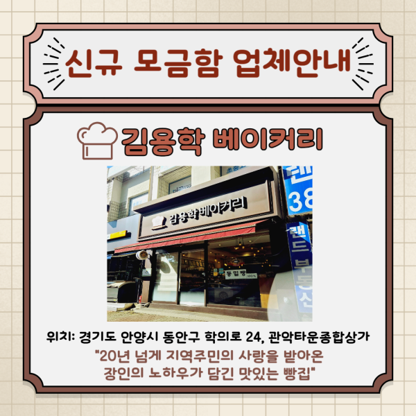목록 김용학베이커리 페이지 정보 이재인 조회 17 입력 2025-07-23 11:17 댓글 0 본문 위 업체는 안양시관악장애인종합복지관에 후원해주시는 '든든한 이웃'입니다.많은 관심과 이용부탁드립니다.주소: 경기도 안양시 동안구 학의로 24, 관악아파트 상가동김용학베이커리<클릭 목록 이전글임마누엘식당 본점 2025.07.23 다음글안양새천년약국 2025.07.23 댓글 0 댓글목록 등록된 댓글이 없습니다.