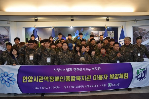 안양시관악장애인종합복지관(관장 박용구) 참여 주간보호센터, 평생교육지원팀 이용자들은 지난 11월 26일에 제51보병사단(사단장 손대권) 전승신병교육대를 방문하여 행복하고 건강한 병영체험에 참여를 하였습니다.