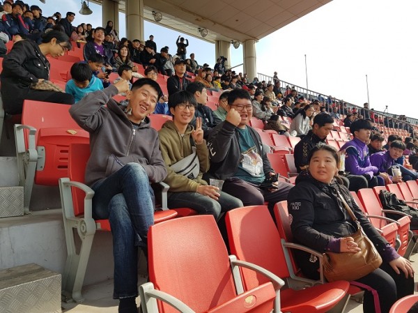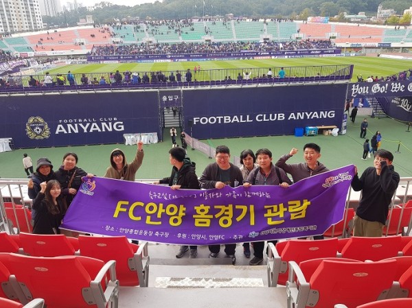 10월 26일 토요일 날씨 좋은 날 축구교실에서는 안양FC 홈경기를 관람하기 위해 안양종합운동장 축구장으로 향했습니다~ 즐겁고 기대되는 마음으로 모여 축구경기를 관람하였습니다. 지역사회 축구단 안양FC의 승리를 외치며 열심히 응원을 하였습니다. 응원하면서 서로 하나가 되어 단합된 모습도 보여 주었답니다~ 안양 시민들과 함께 열정적으로 응원을 하였고 마침내 후반전에 동점골과 역전골을 넣게 되면서 안양 FC가 승리하게 되었습니다!! 응원팀이 이겨서 더 재미있는 축구경기 관람이 시간이 될 수 있었던 것 같습니다.