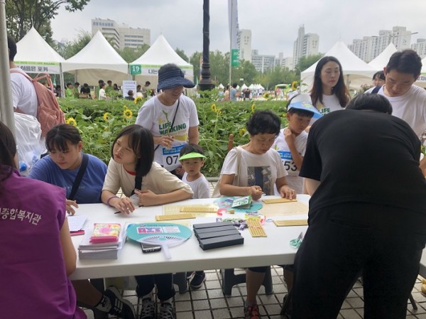이번 캠페인은 특별히 율목종합사회복지관에서 주관하는 '2019 함께 걷기'와 연계하여 외부부스로 참여하였는데요, 걷기축제 참여자 7,000명을 대상으로 진행되었으며, 참여자들을 대상으로 OX퀴즈, 난화그리기, 점자체험 등 다양한 활동으로 캠페인을 진행하였습니다.