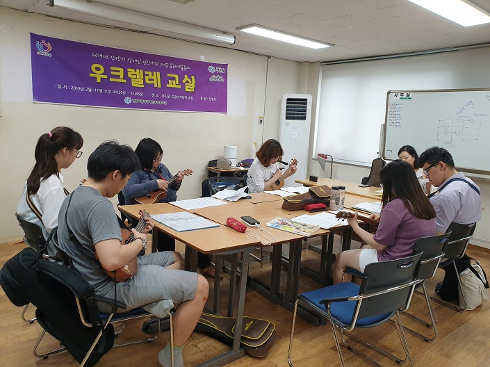 매주 금요일 16시 30분부터 17시 45분까지 문혜경 강사님과 8명의 이용자들이 우쿠렐레 수업에 참여하고 있습니다. 새로운 코드를 배우고, 다양한 곡을 연주하며 연주실력을 향상하기 위해 노력하고 있습니다.