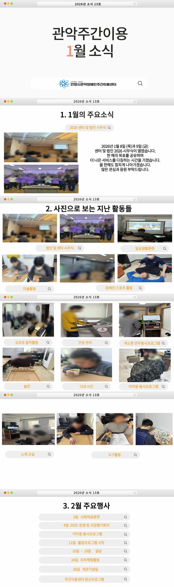 목록 2026년 주간이용센터 1월 소식 페이지 정보 정지영 조회 52 입력 2026-01-30 14:45 댓글 0 본문 2026년의 시작과 함께 주간이용센터에서는 다양한 1월 활동이 진행되었습니다.이용인분들의 건강하고, 줄거운 일상을 위해 여러 프로그램등을 지원했습니다. 앞으로도 이용인분들의 삶에 활력을 더할 수 있도록 최선을 다하겠습니다.많은 관심과 응원 부탁드립니다. 목록 다음글장애아동특수치료사 지원사업 - 작업치료 2026.01.28 댓글 0 댓글목록 등록된 댓글이 없습니다.