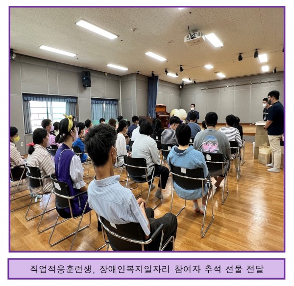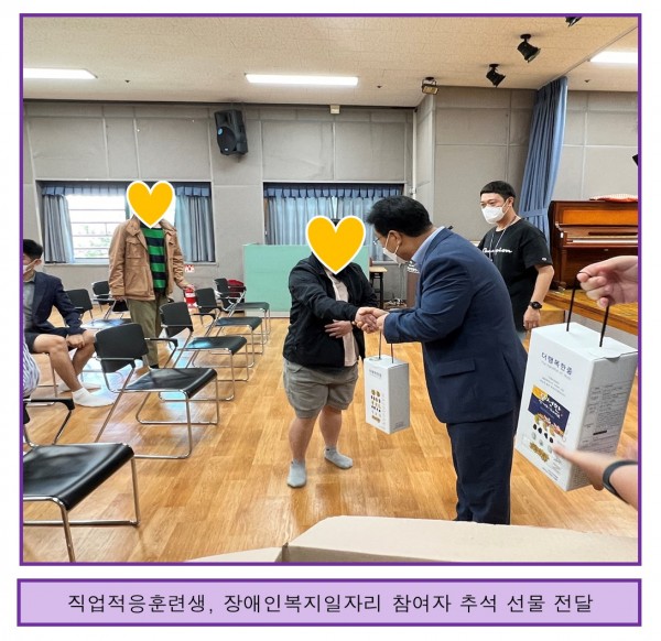 2022년 9월 7일(수) 복지관 4층 강당에서 직업적응훈련반, 작업활동1·2반 훈련생들과, 장애인복지일자리 참여자들에게 추석 선물을 전달하였습니다.