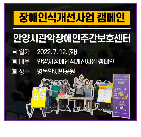 목록 관악주간보호센터 안양시장애인식개선 캠페인 페이지 정보 박성배 조회 1,069 입력 2022-07-13 16:12 댓글 0 본문 안양시관악장애인주간보호센터에서는 안양시장애인시개선사업으로 캠페인 진행하였습니다. "안양시장애인시개선사업"은 안양시민에게 장애인에 대해 긍정적으로 인식은 전환하고, 참여자의 자아존중감을 향상하고자 합니다. 목록 이전글2022년 정보기술자격 (ITQ) 시험 진행 2022.07.15 다음글관악주간보호센터 현장학습(해우재 박물관) 2022.07.12 댓글 0 댓글목록 등록된 댓글이 없습니다.