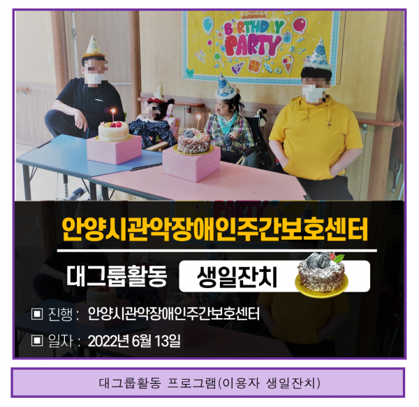 매월 주간보호센터 생일 맞이한 이용자에게 행복한 추억을 선물하기 위해서 케익과 함께 모든 이용자가 생일 축하 노래를 불렀습니다.