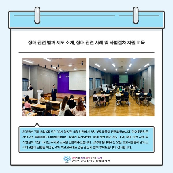 2025년 7월 15일(화) 오전 10시 복지관 4층 강당에서 3차 부모교육이 진행되었습니다.