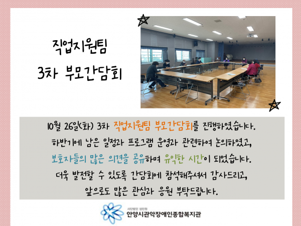 목록 직업지원팀 3차 부모간담회 페이지 정보 운영자 조회 1,188 입력 2021-10-29 11:04 댓글 0 본문 목록 이전글가족기능강화사업 맘스터치 2차 프로그램 진행 2021.11.02 다음글2021 안양시 장애인식개선사업 손끝으로 만드는 세상 7차 진행 2021.10.28 댓글 0 댓글목록 등록된 댓글이 없습니다.