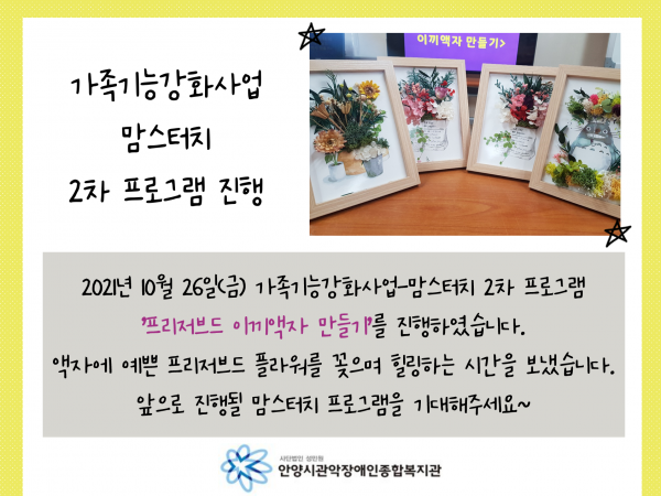 목록 가족기능강화사업 맘스터치 2차 프로그램 진행 페이지 정보 운영자 조회 1,130 입력 2021-11-02 13:14 댓글 0 본문 목록 이전글♥ 너랑 나랑 ♥ 형제자매 관계 개선 프로그램 2차 프로그램 미술치료, 부모교육. 2021.11.02 다음글직업지원팀 3차 부모간담회 2021.10.29 댓글 0 댓글목록 등록된 댓글이 없습니다.