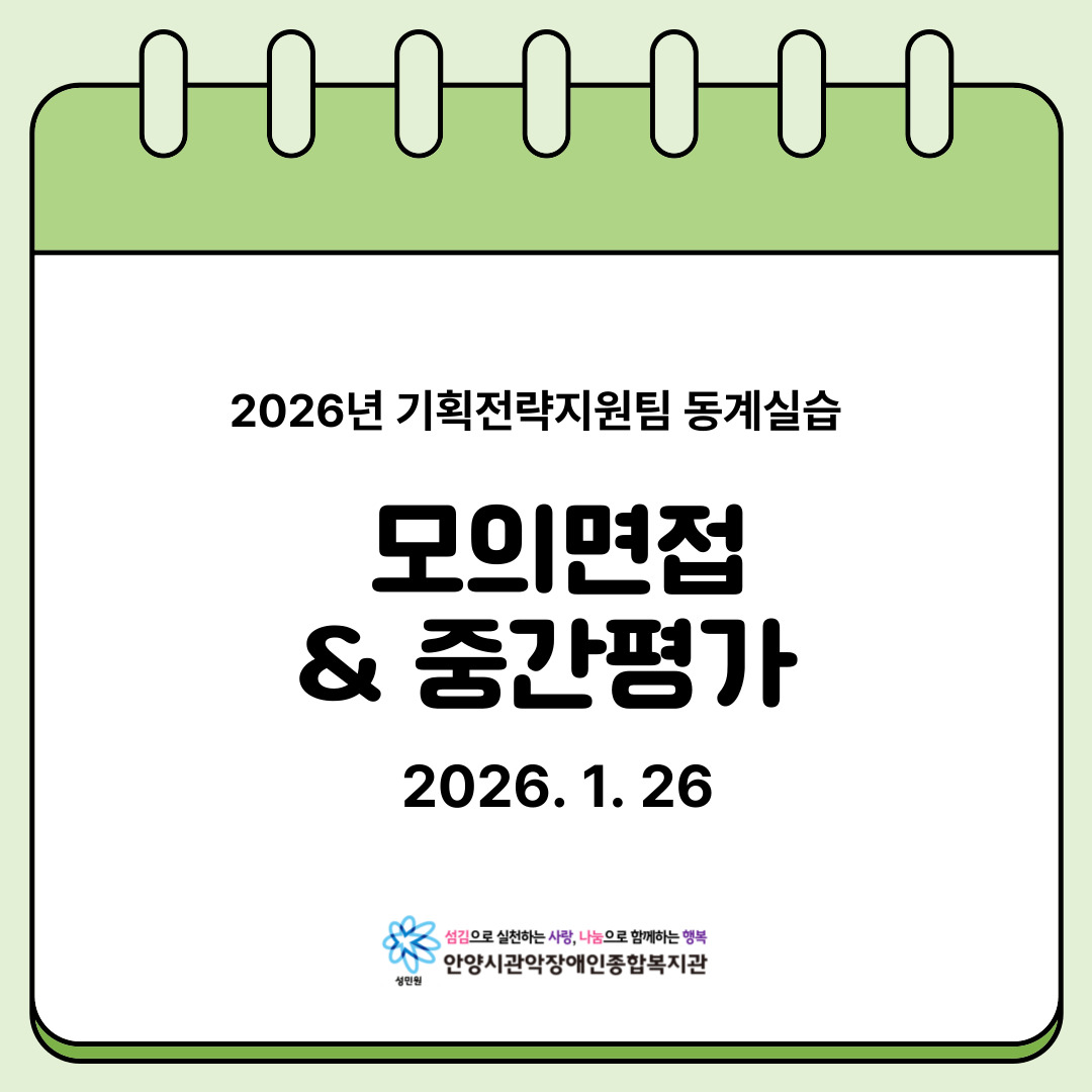 목록 2026년 동계 사회복지실습 모의면접&중간평가 진행 페이지 정보 실습생 조회 46 입력 2026-01-30 15:28 댓글 0 본문 관련링크 https://www.ajwc.or.kr/data/editor/2602/571696cc91ba2e776079f3f9371179… 3회 연결 목록 이전글2026년 상담가족지원팀 동계실습 ‘재가장애인 이미용서비스’ 2026.01.30 다음글2026년 평생교육지원팀 동계실습 ‘겨울 계절학교 외부활동’ 2026.01.30 댓글 0 댓글목록 등록된 댓글이 없습니다.