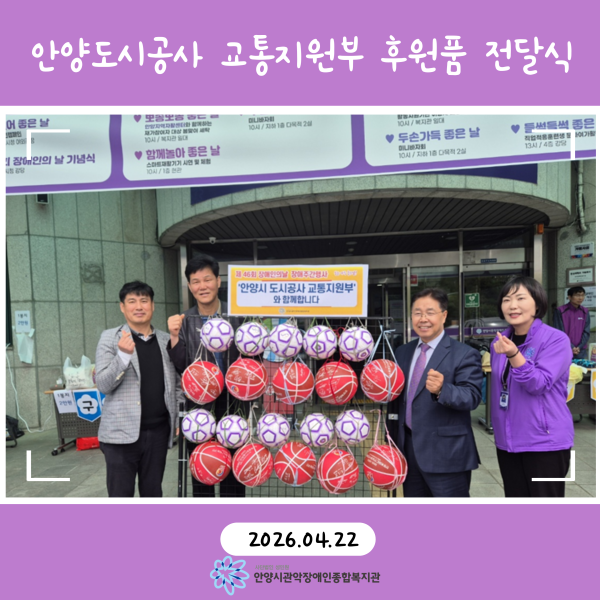 후원해주신 FC안양 축구공과 안양 정관장 농구공은 장애주간행사 기간 동안 이벤트에 활용될 예정이며,