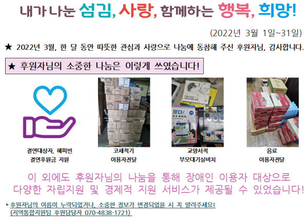 목록 2022년 3월 후원이야기 페이지 정보 이재인 조회 833 입력 2022-04-01 13:48 댓글 0 본문 목록 이전글<해피빈참여안내> 든든한 하루를 위한 밑반찬을 선물해 주세요 2022.04.18 다음글신규 모금함 비치 업체 안내 -나리테이블, 황태섭 자연베이커리 2022.03.24 댓글 0 댓글목록 등록된 댓글이 없습니다.