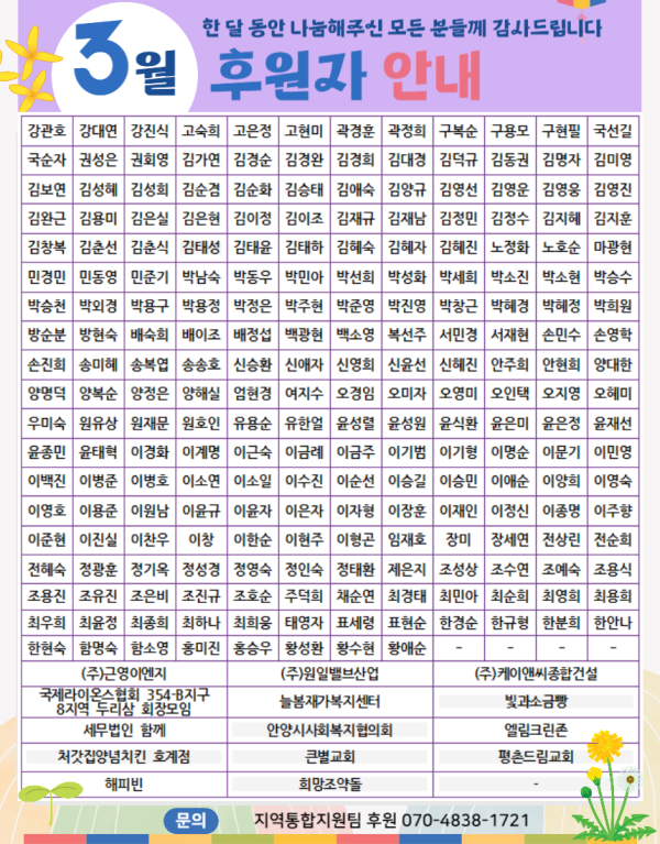 목록 2026년 3월 함께하는사람들 페이지 정보 이재인 조회 3 입력 2026-04-24 16:31 댓글 0 본문 후원자님의 이름이 누락되었거나, 정보가 변경되었을 시 꼭 알려주세요! 후원해주신 성금과 물품을 투명하고 공정하게 사용하여 도움이 필요한 분들에게 희망이 될 수 있도록 노력하겠습니다.진심으로 감사드립니다.(지역통합지원팀 후원담당자 070-4838-1721) 목록 다음글2026년 2월 함께하는 사람들 2026.03.11 댓글 0 댓글목록 등록된 댓글이 없습니다.