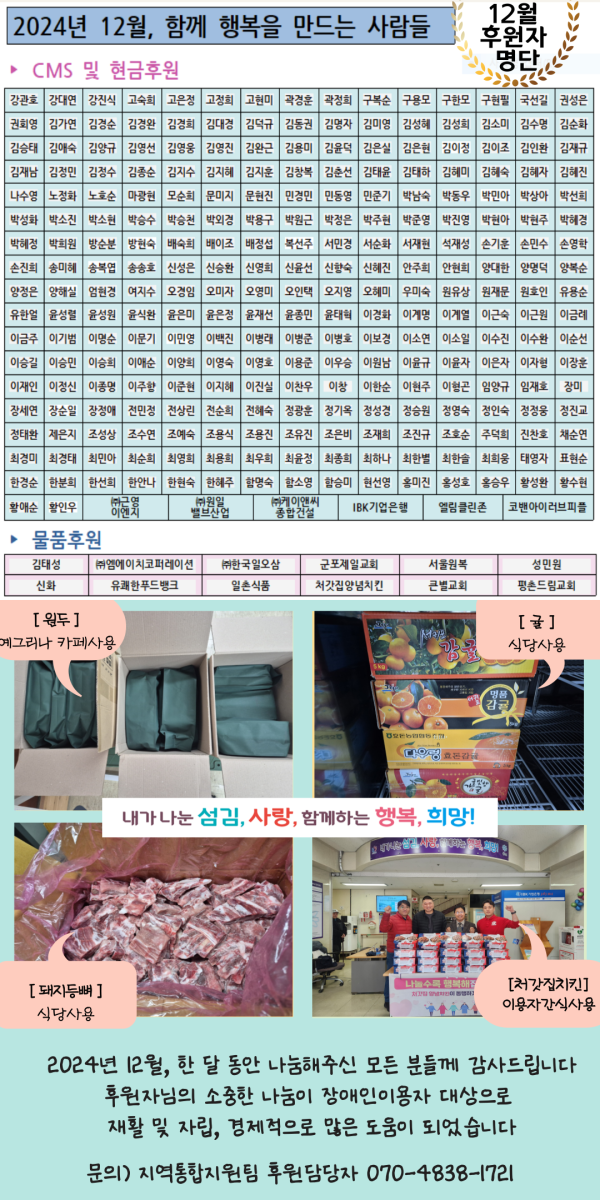 목록 2024년 12월 후원이야기 페이지 정보 이재인 조회 57 입력 2025-02-03 17:54 댓글 0 본문 후원자님의 이름이 누락되었거나, 정보가 변경되었을 시 꼭 알려주세요! 후원해주신 성금과 물품을 투명하고 공정하게 사용하여 도움이 필요한 분들에게 희망이 될 수 있도록 노력하겠습니다.진심으로 감사드립니다.(지역통합지원팀 후원담당자 070-4838-1721) 목록 이전글2025년 1월 후원이야기 2025.03.05 다음글2024년 11월 후원이야기 2024.12.11 댓글 0 댓글목록 등록된 댓글이 없습니다.