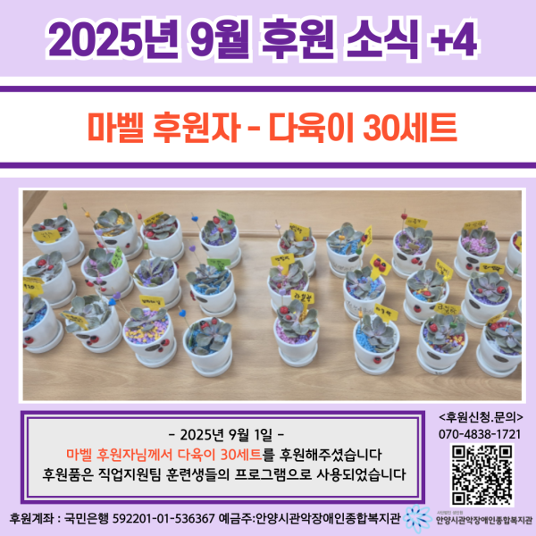 목록 2025년 9월 후원소식 +4 페이지 정보 이재인 조회 1,260 입력 2025-09-09 15:29 댓글 0 본문 후원해주신 마벨에 감사의 마음♥을 전합니다더 좋은 모습으로 보답하겠습니다!'마벨' 은 안양시관악장애인종합복지관의 든든한 이웃입니다많은 관심과 이용부탁드립니다. 목록 다음글2025년 9월 후원소식 +3 2025.09.05 댓글 0 댓글목록 등록된 댓글이 없습니다.
