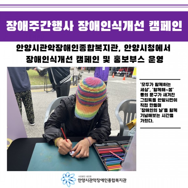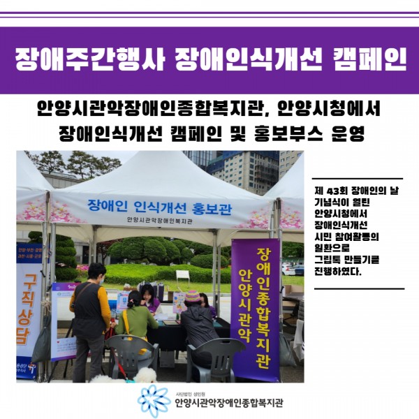 2023년 4월 20일 목요일 안양시관악장애인종합복지관, 안양시청에서 장애인식개선 캠페인 및 홍보부스 운영