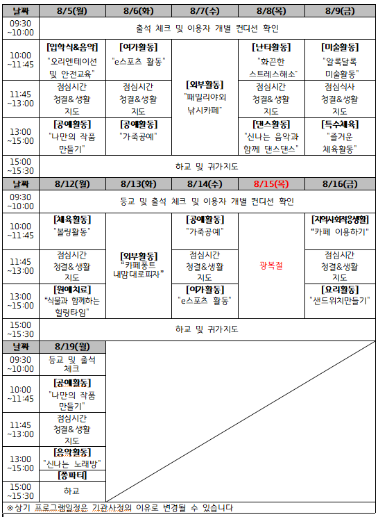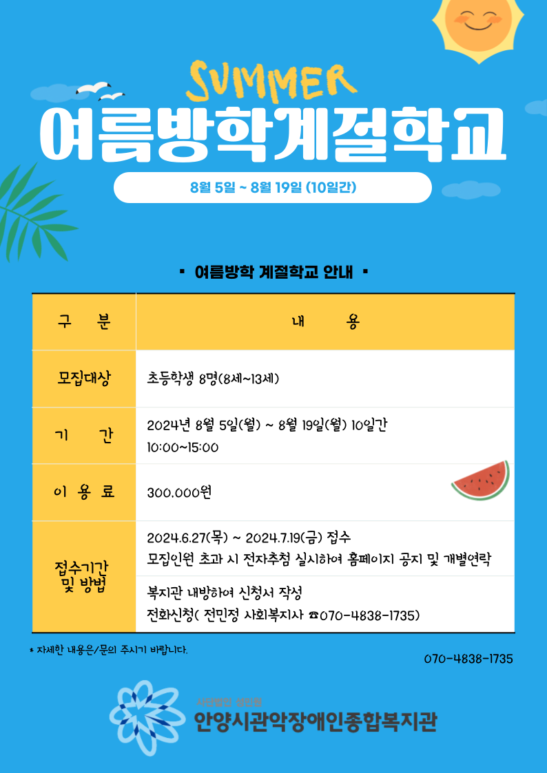 안양시관악장애인종합복지관에서 2024년 여름방학 계절학교 이용자를 모집합니다.