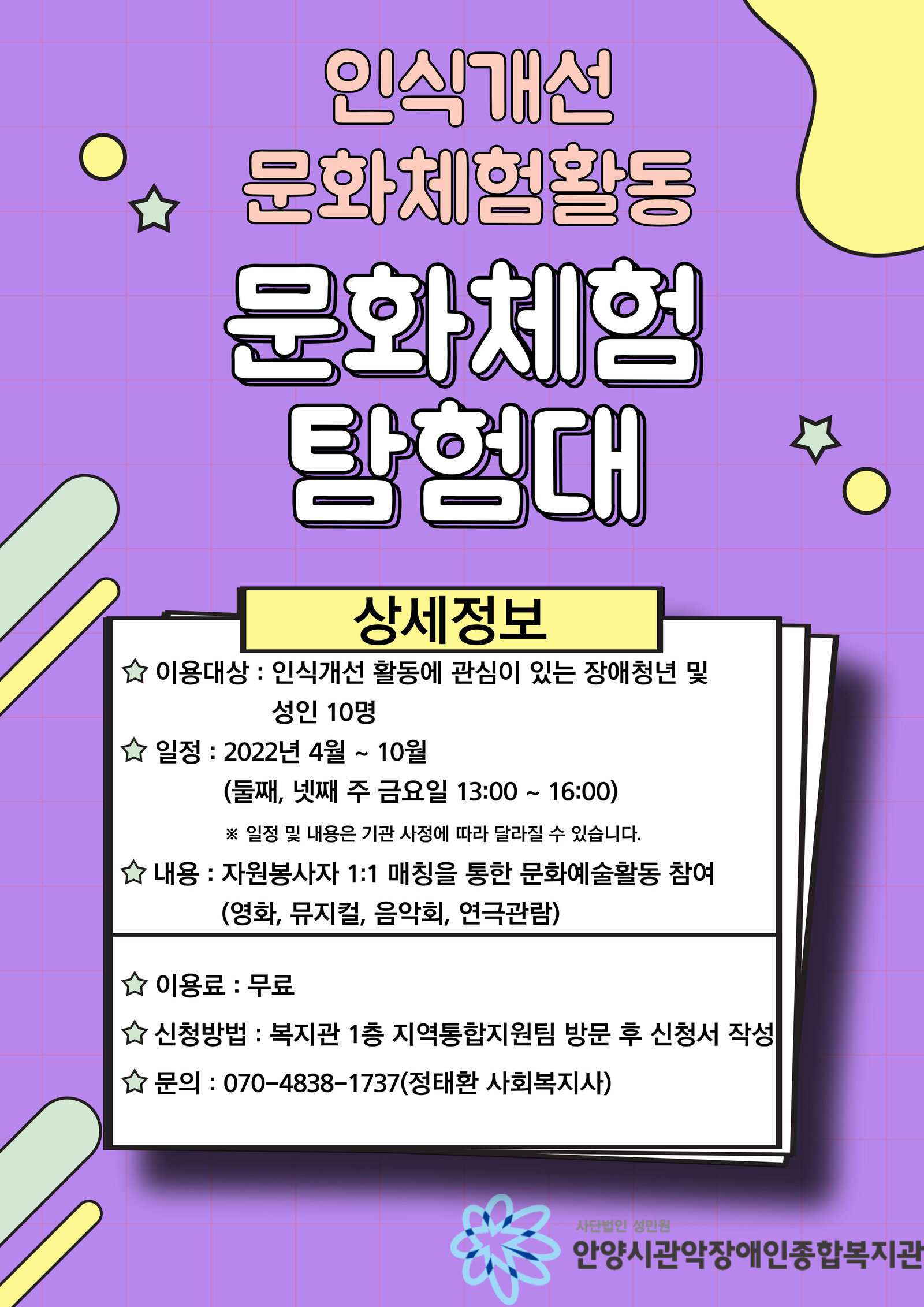 지역통합지원팀에서 진행하는 장애인식개선사업 문화체험 탐험대에 참여할 이용자분들을 모집하고 있습니다.
