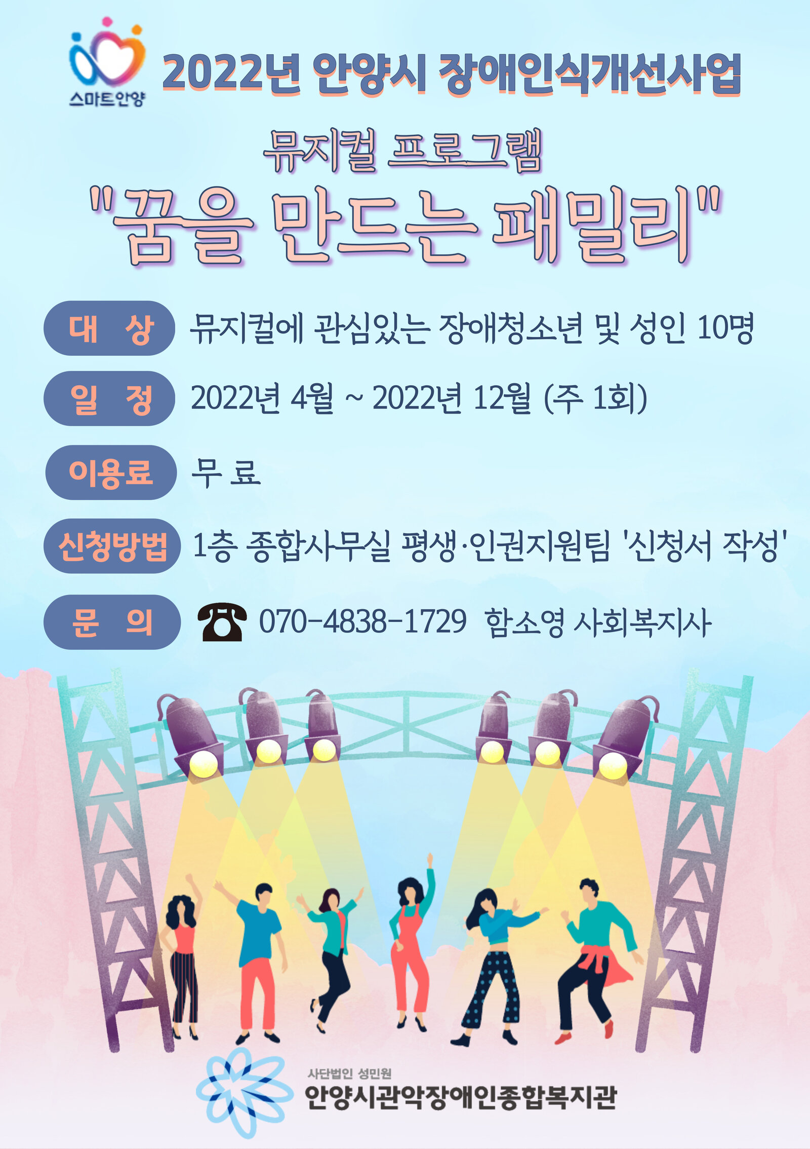 평생·인권지원팀에서는 2022년 장애인식개선사업 뮤지컬교실 이용자를 아래와 같이 모집하고자 합니다.