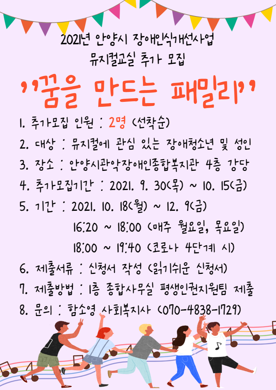 평생인권지원팀에서는 2021년 장애인식개선사업 뮤지컬교실(꿈을 만드는 패밀리) 이용자를 아래와 같이 추가 모집하고자 합니다.