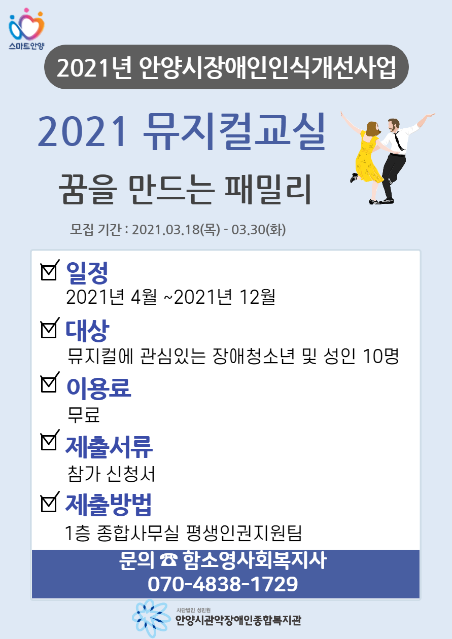 평생·인권지원팀에서는 2021년 장애인식개선사업 뮤지컬교실 이용자를 아래와 같이 모집하고자 합니다.