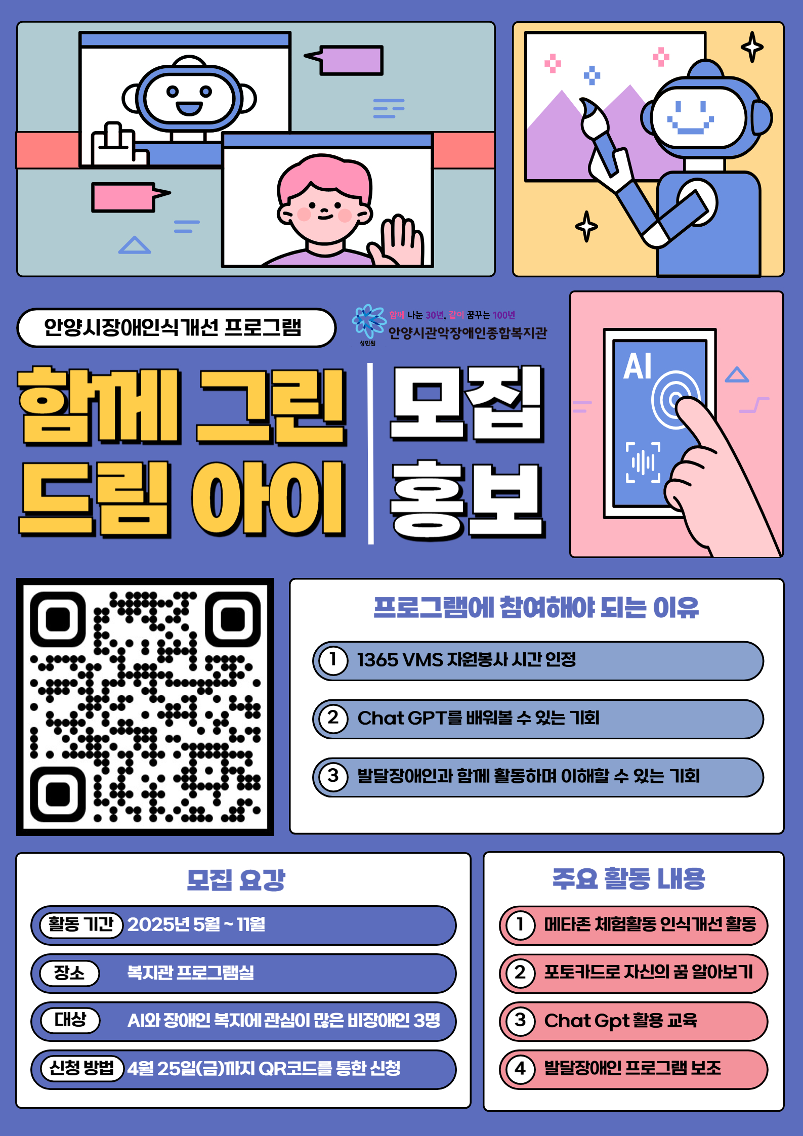 2025년 안양시장애인식개선사업 '함께 그린 드림아이(AI)' 프로그램에 함께 할 비장애인 참여자를 모집합니다.