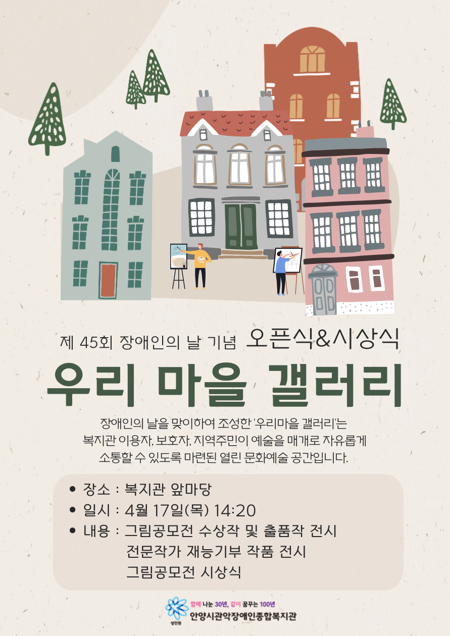4월 17일(목) 2025년 제 45회 장애인의 날 기념 '우리 마을 갤러리' 오픈식과 시상식이 진행됩니다.