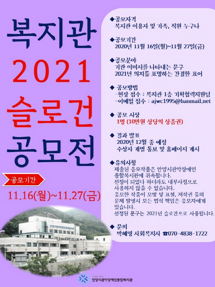 안양시관악장애인종합복지관에서 2021 복지관 슬로건 공모를 실시합니다.