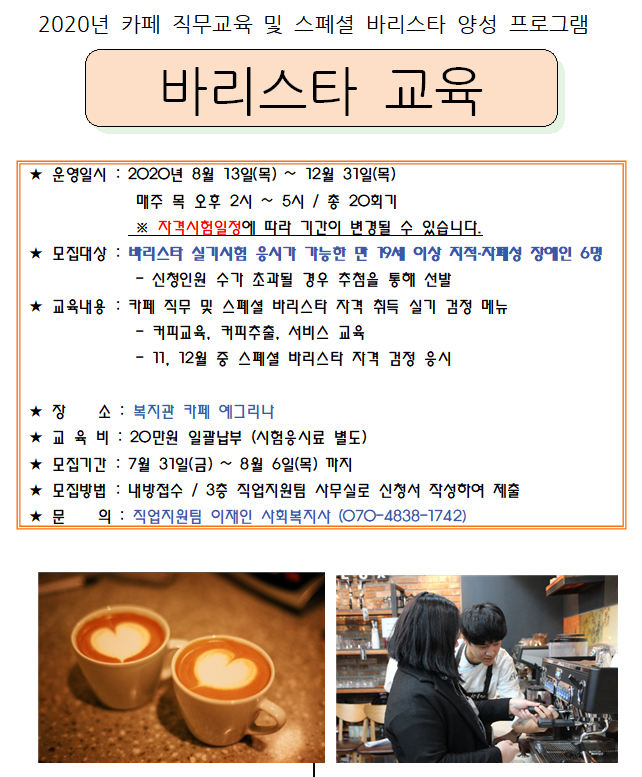 2020년 직업지원팀 바리스타교육생 모집 공고