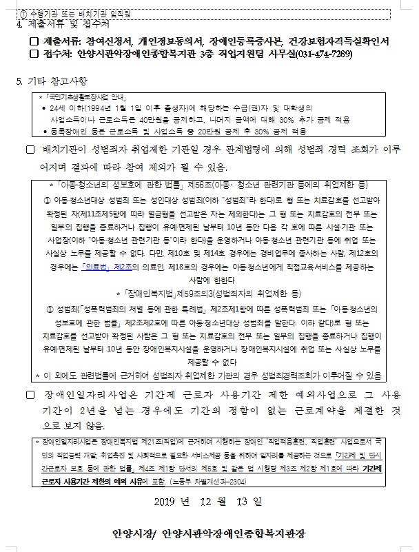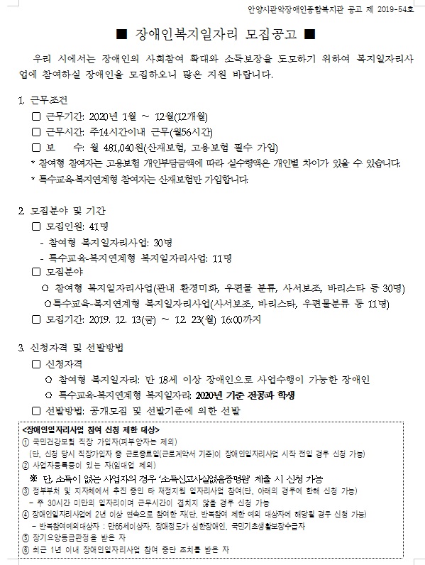 2020년 장애인복지일자리사업 참여자 모집 공고