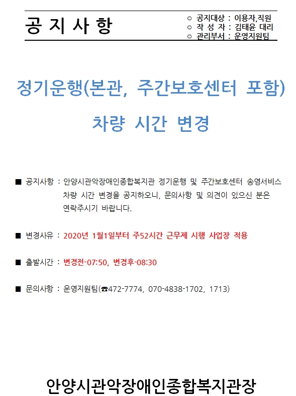 정기셔틀운행 시간 및 노선 변경 안내 > 공지사항