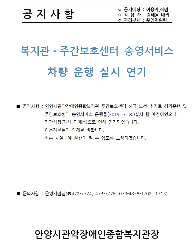 복지관•주간보호센터 송영서비스 연기 안내 > 공지사항
