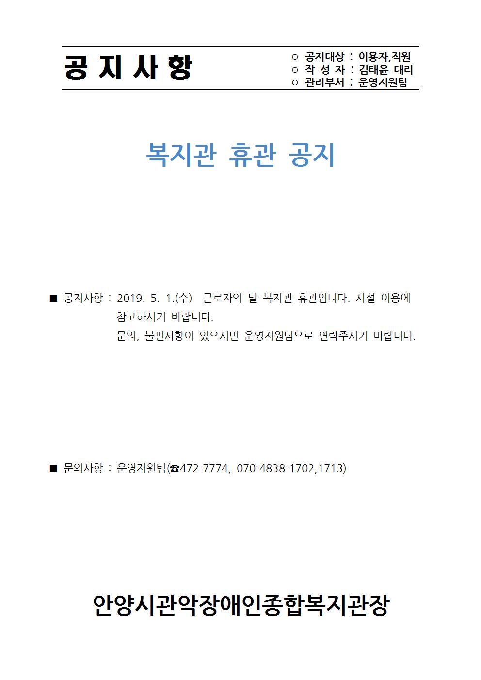 복지관 휴관과 관련하여 위와 같이 공지드립니다. 참고하셔서 복지관 이용에 불편함이 없으시길 바랍니다.