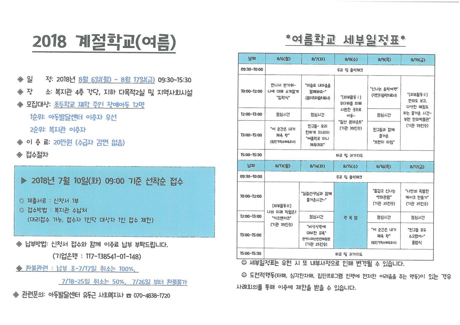 2018 계절학교(여름) 모집안내