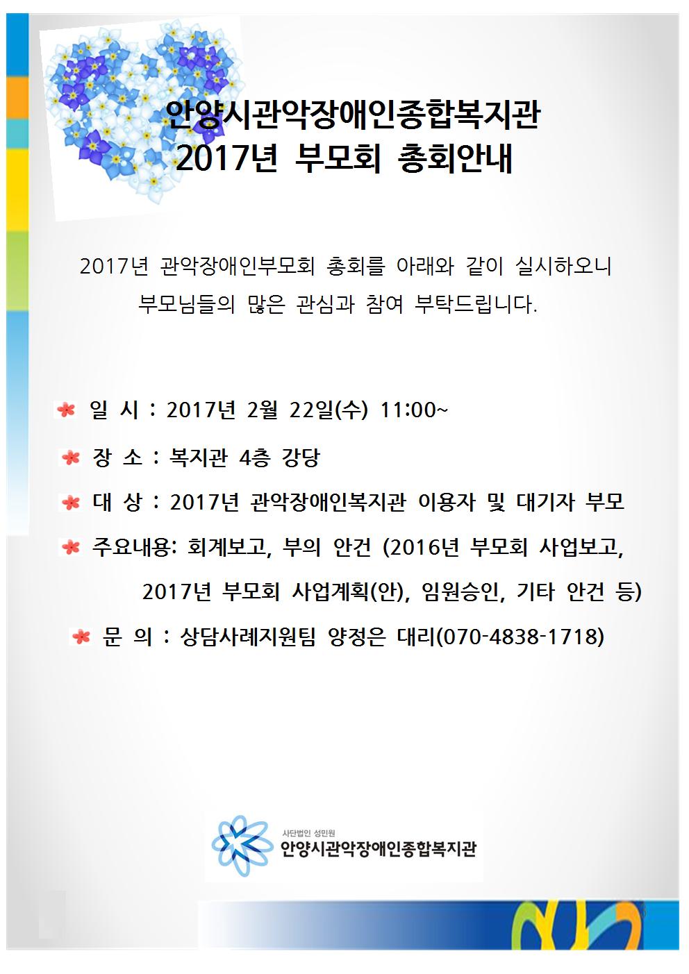 * 주요내용: 회계보고, 부의 안건 (2016년 부모회 사업보고, 2017년 부모회 사업계획(안), 임원승인, 기타 안건 등)