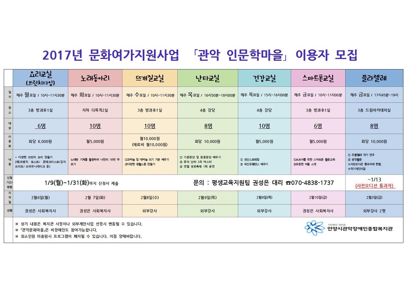2017년 문화여가지원사업 「관악 인문학마을」이용자 모집