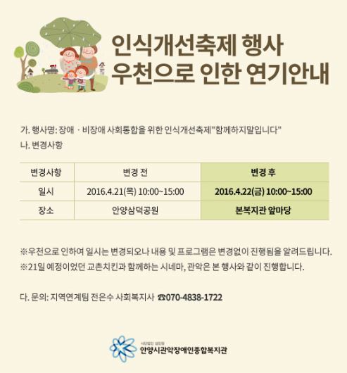 장애인식개선축제 우천으로 인한 일정연기안내 > 공지사항
