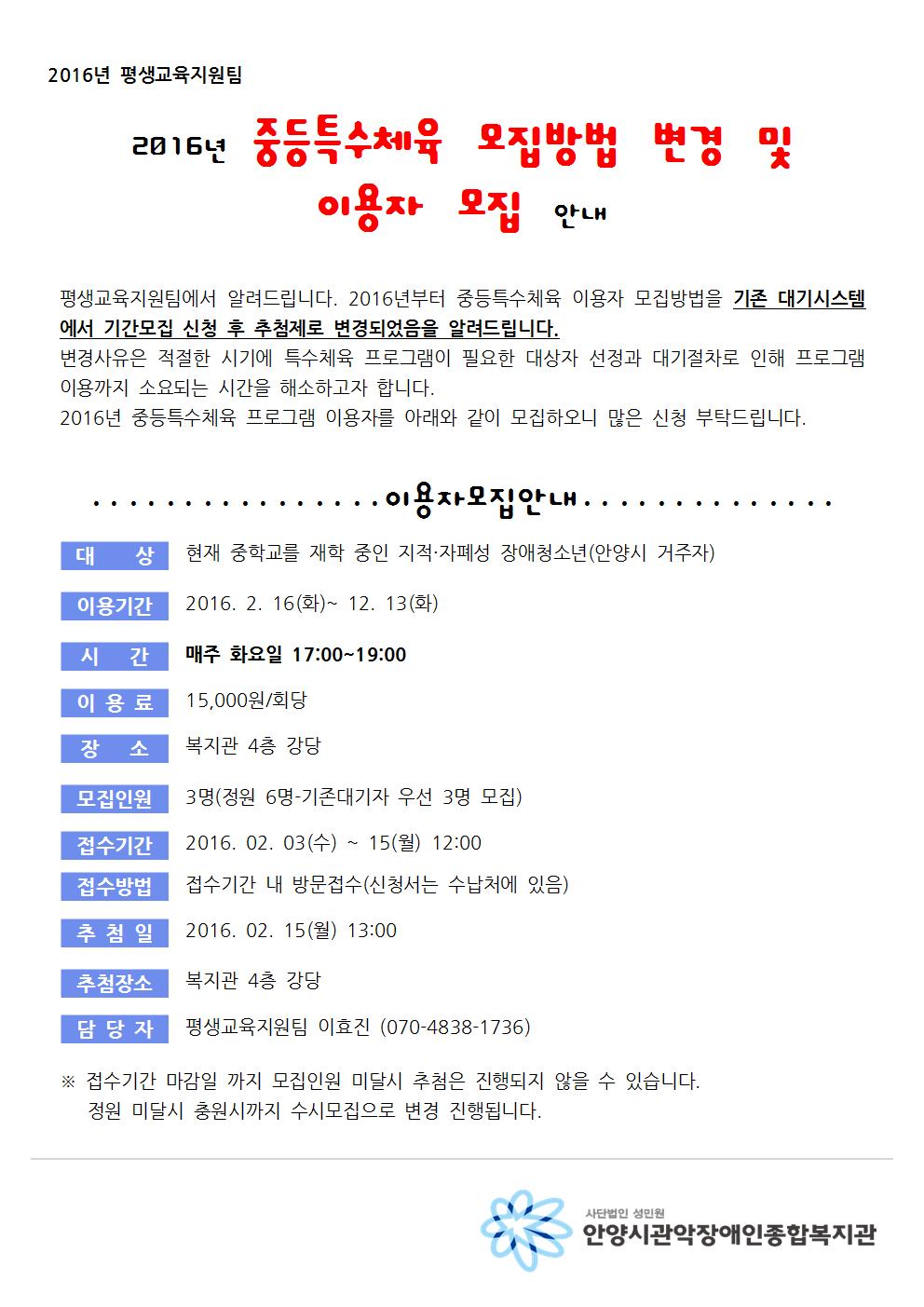중등특수체육 모집방법 변경 및 이용자 모집 안내