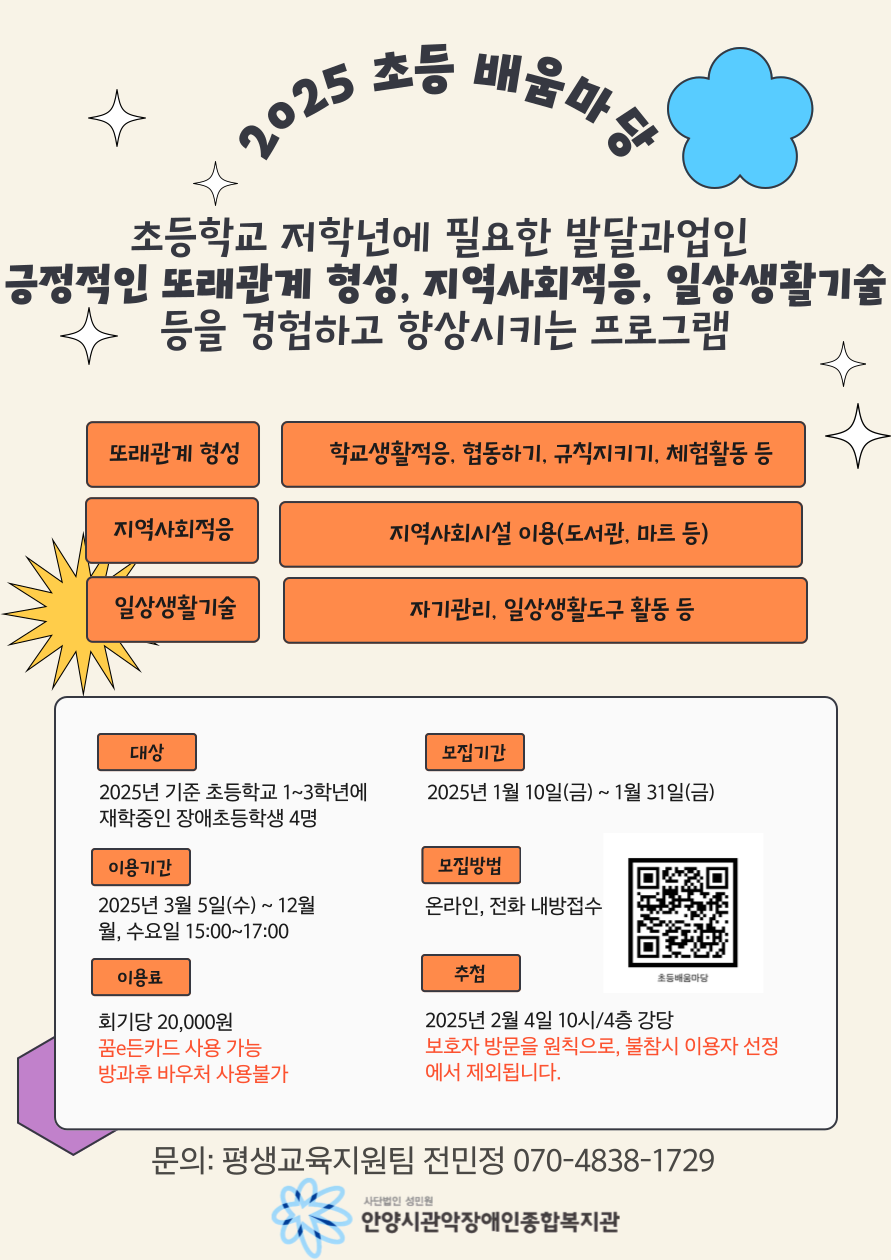 2025년 평생교육지원팀에서는 2025년 초등배움마당 프로그램 이용자를 아래와 같이 모집하고자 합니다.