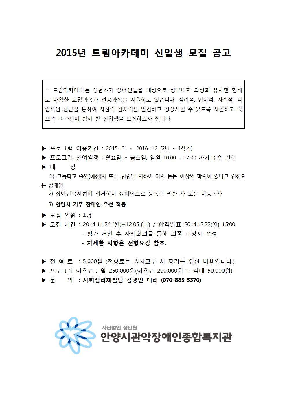 2015년 드림아카데미 신입생 모집 공고 > 공지사항