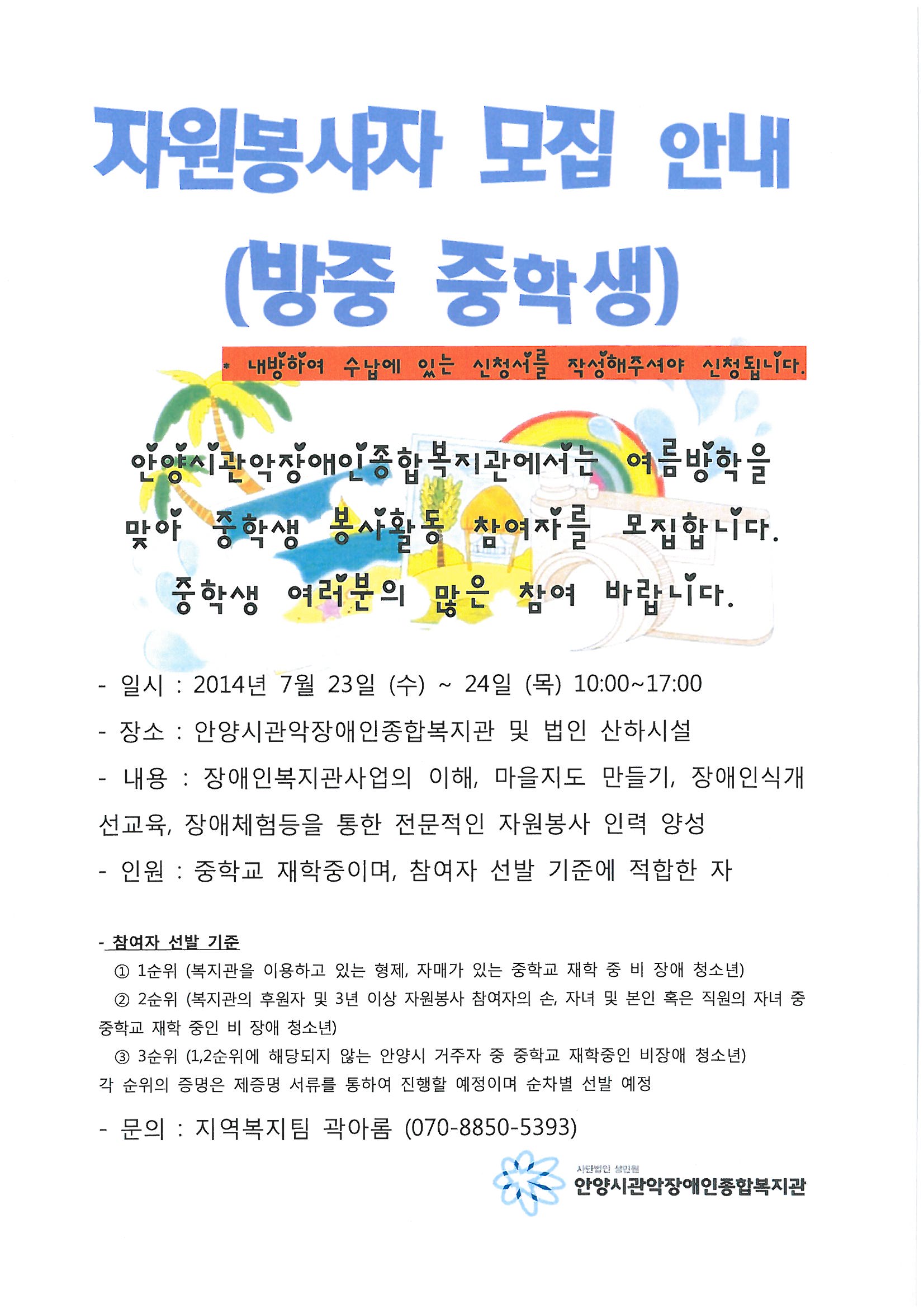 자원봉사자 모집 안내(방중 중학생) > 공지사항