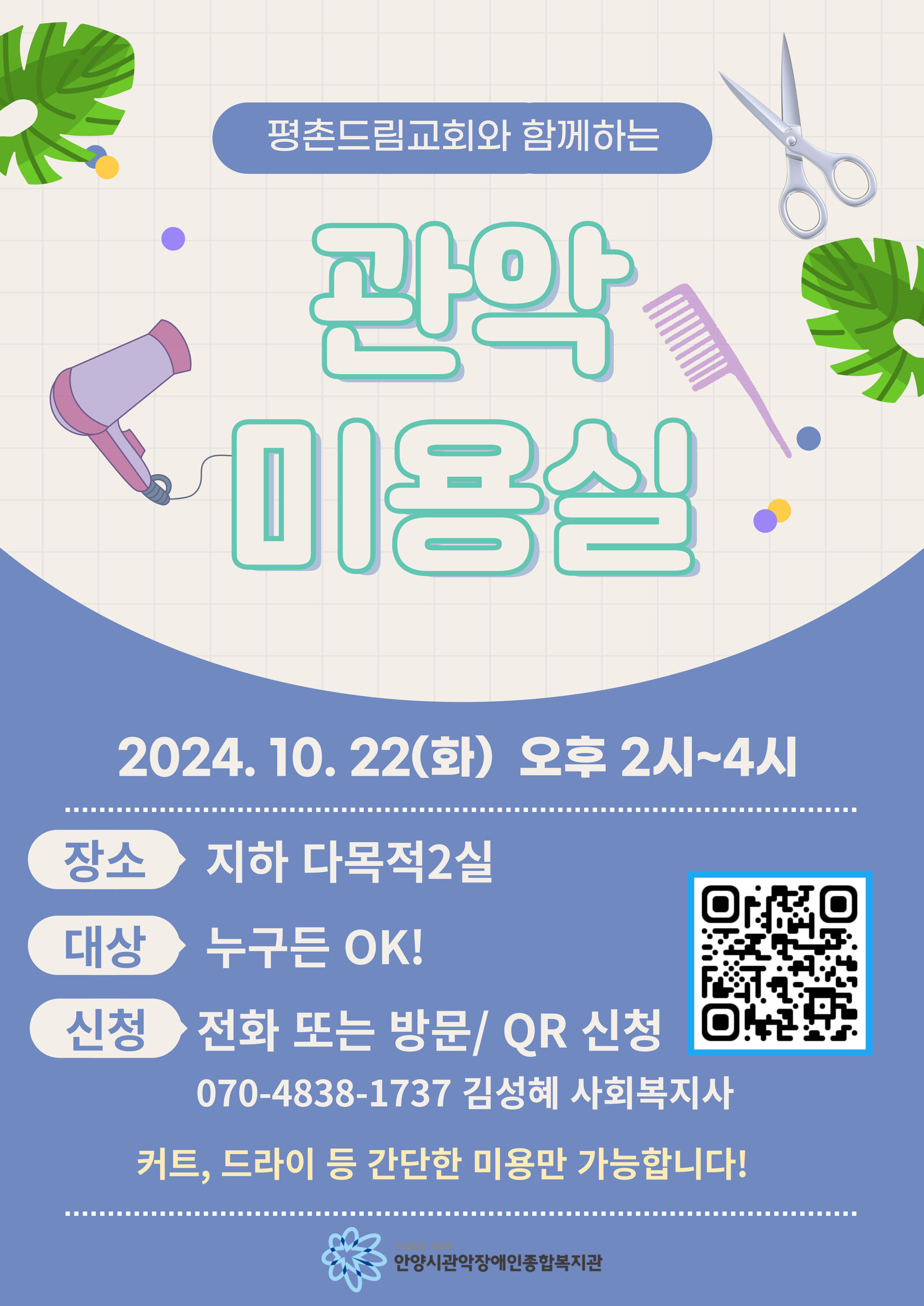 평촌드림교회와 함께하는 관악미용실 참여자를 모집합니다! 신청하실 분들은 홍보지의 QR 코드 스캔하여 신청하시거나